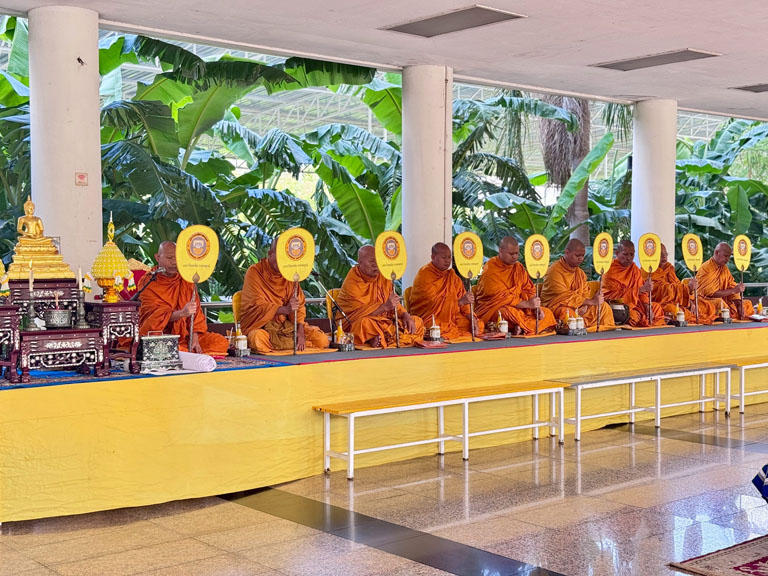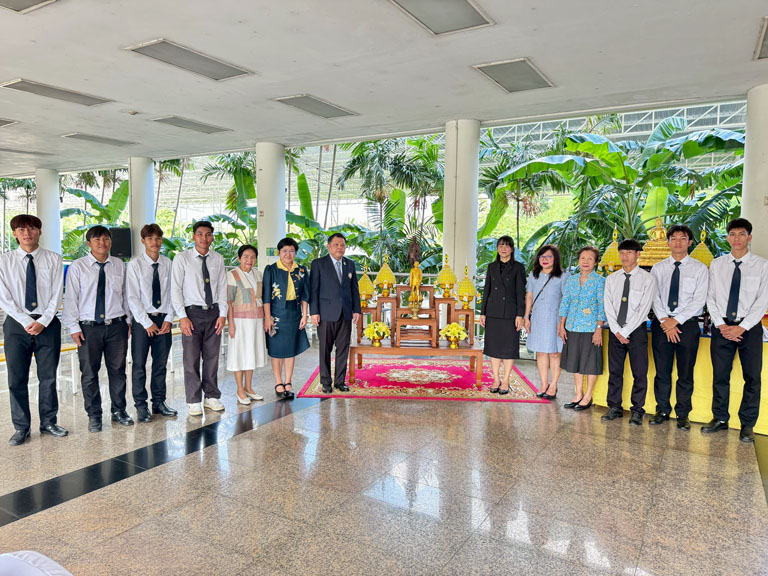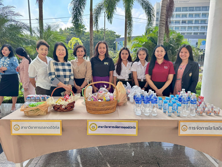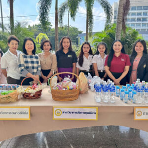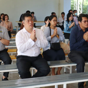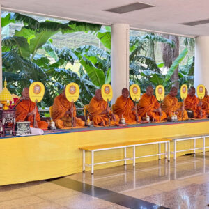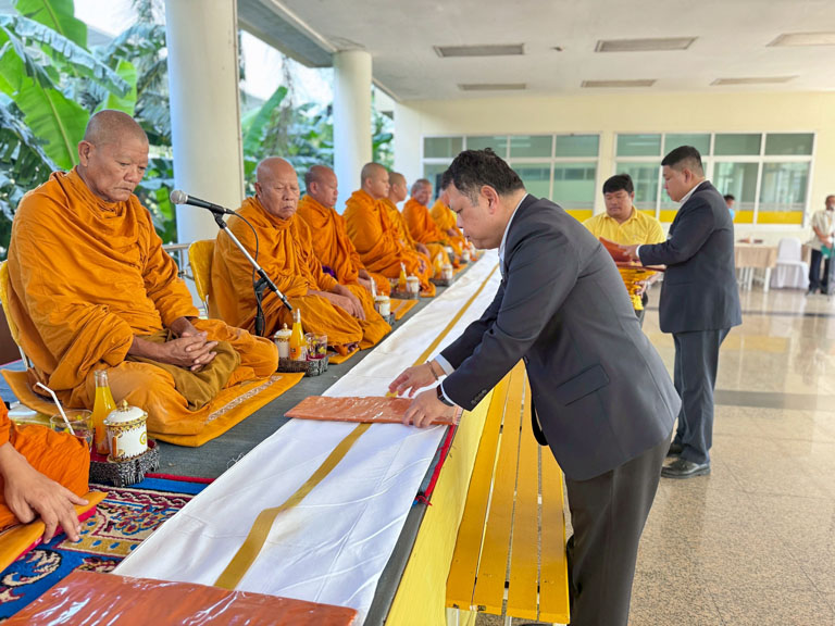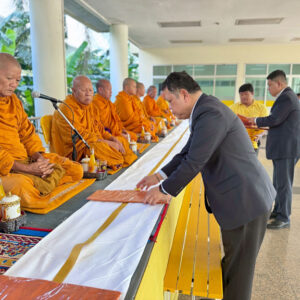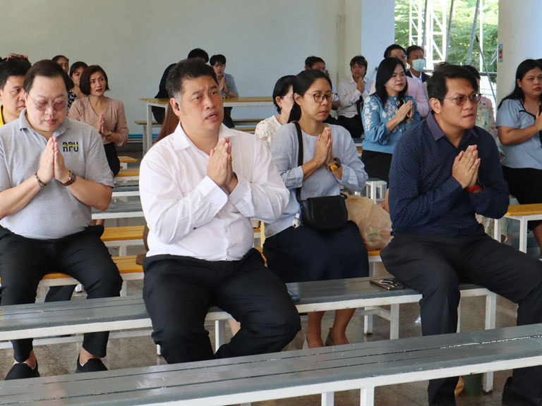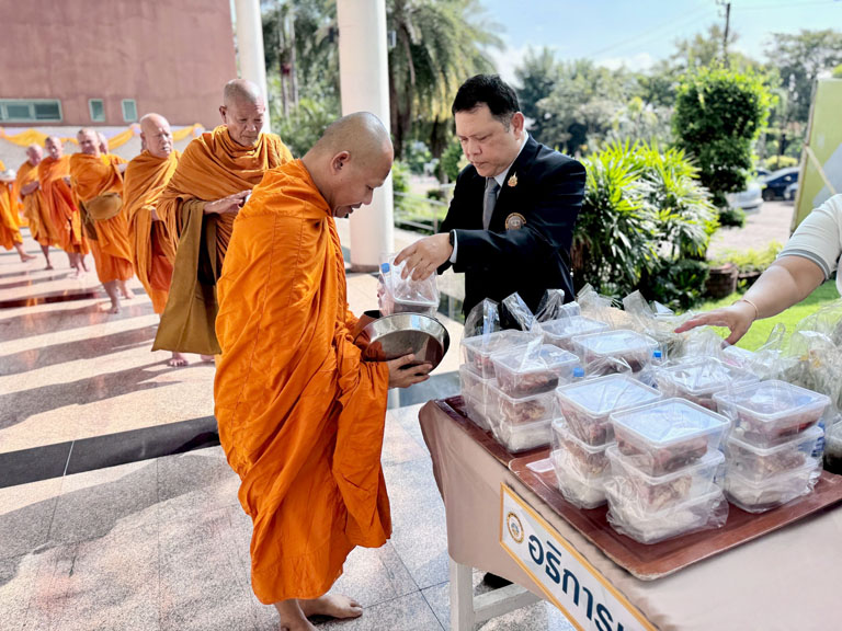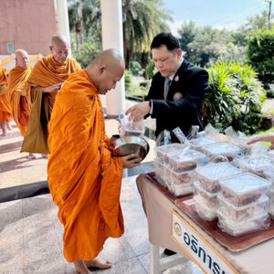 Dr. Anawut Choosup, President of Rajapruk University, presided over the solemn ceremony. The event saw the participation of university executives, faculty members, staff, and students who together offered alms to nine Buddhist monks from Wat Song Phlu. The ceremony was respectfully held in the lobby of the Commemoration Building at Rajapruk University.